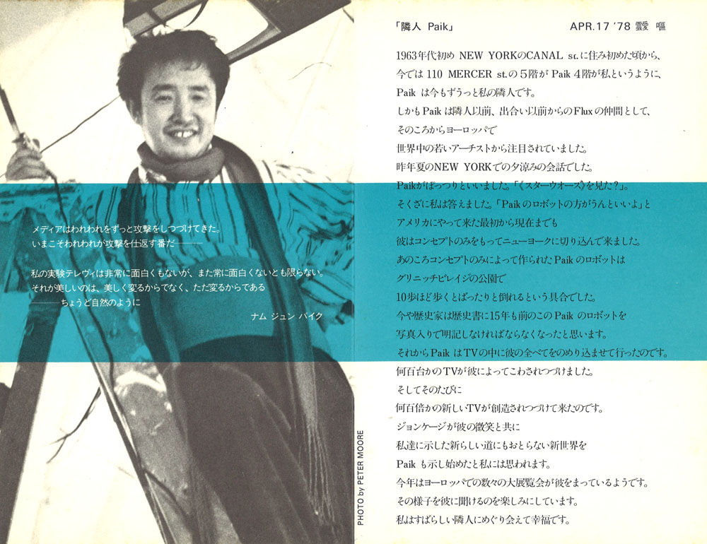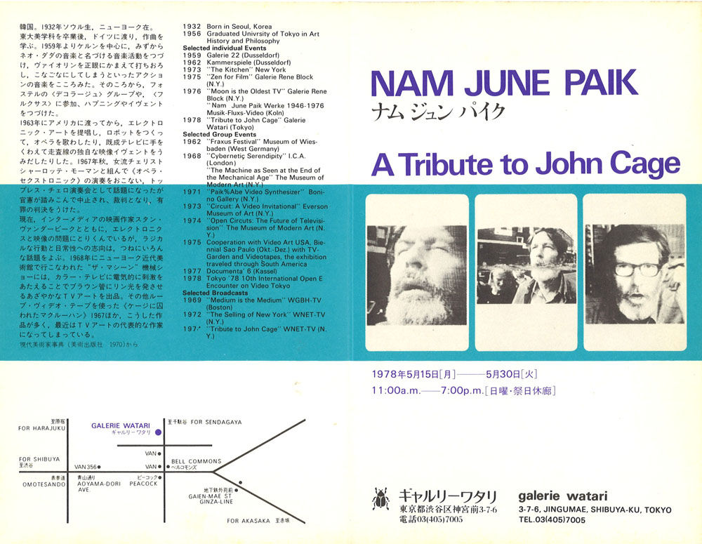 *「NAM JUNE PAIK A Tribute to John Cage」案内状(1978年、ギャルリーワタリ)より転載