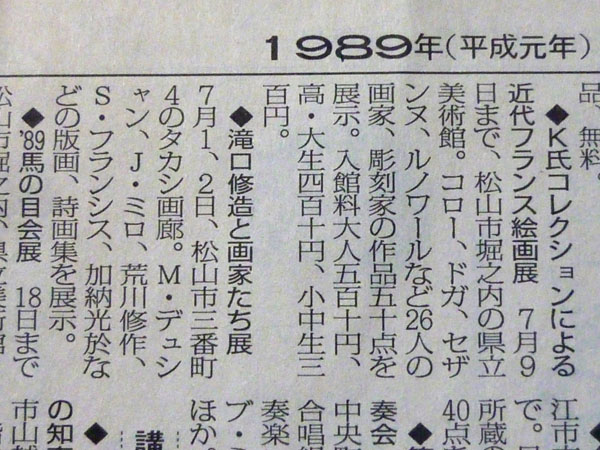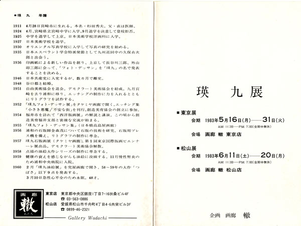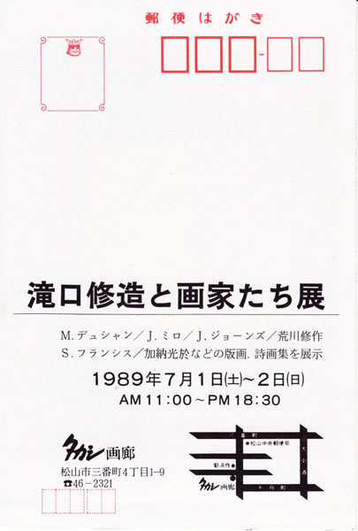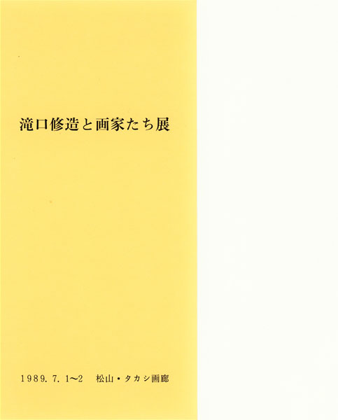 会場については松山市の画廊での開催が念頭にあり、市の中心部に位置する三番町の「タカシ画廊」に目星を付けていた。ここは、以前東京銀座の「画廊轍」の松山店として1983年に「瑛九展」が開催され、独立し移転してからは1985年に「宇樹夢舟銅版画展」を行い、その折に発行されたリーフレットに美術評論家の瀬木慎一が寄稿し瀧口のことに触れていた経緯もあり、この画廊なら引き受けてもらえそうな予感があった。