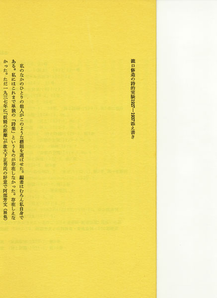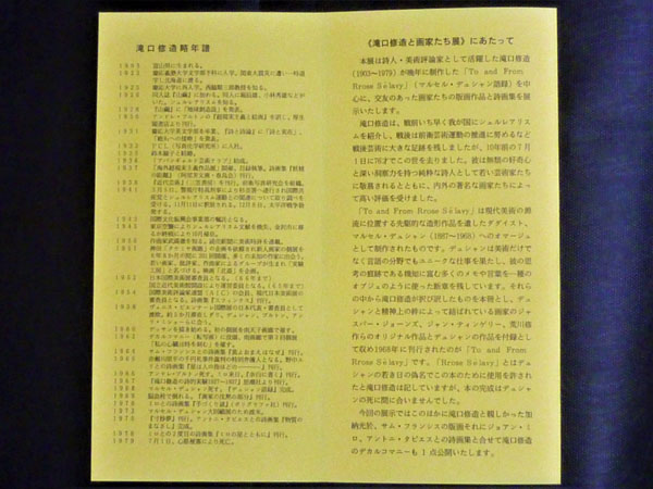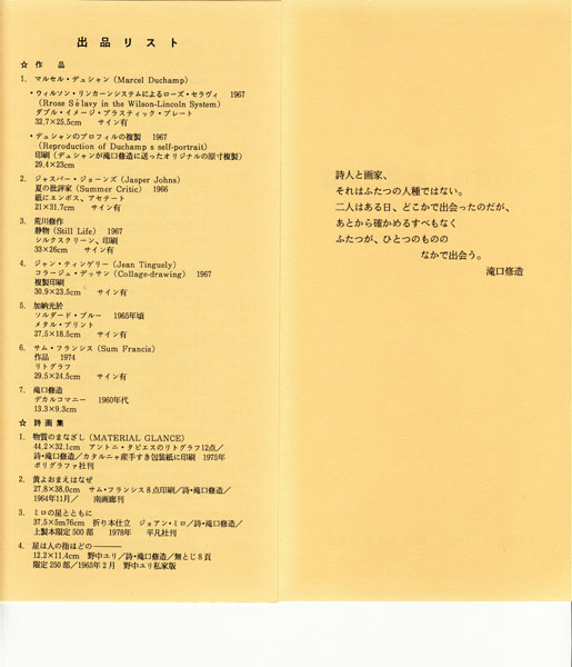 リーフレットは「瀧口修造の詩的実験1927~1937」(1967年思潮社刊)に付いている「添え書き」を参考に黄色い紙を三つ折りにすることにした。序詞として大岡信と加納光於の共作のオブジェの函に寄せて書かれた瀧口の詩「アララットの船あるいは空の蜜へ小さな透視の日々」の冒頭の一節を載せたのは、瀧口自らが詩人と画家の間にあって創作するなかで書くこと描くことの意味を問うキーワードだったからある。そして、開催趣旨と出品リストの他に瀧口の生涯と業績のあらましがわかるように自筆年譜と著作年表から抜粋して略年譜を作成した。友人が営む印刷所に頼んで格安で出来上がったが、折りたたむと長形3号の封筒に納まるサイズで内容ともに自分でも納得できるものだった。