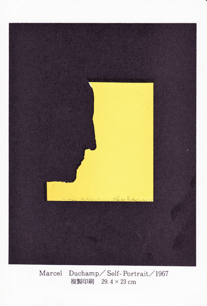 すぐに案内状とカタログ的なリーフレットの作成に取り掛かり、案内状のデザインは「デュシャン語録」に収録されている「self-portrait」を用いることにした。印刷費用を安くするためでもあったが、黒と黄色の2色刷りはシンプルでインパクトがあると思った。