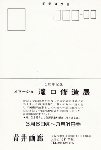 4月頃だったか、いきなり画廊を訪ねて画廊主の隆彰雄さんに面会した。趣旨を説明すると画廊企画としては無理だが、2日間程度なら無償で場所を提供してもよいとのご返事をいただいた。丁度瀧口の月命日の7月1日と翌2日が土曜日曜にあたり、私も仕事を休まなくて済むのでわずか2日間ではあるがその日に開催することが決まった。