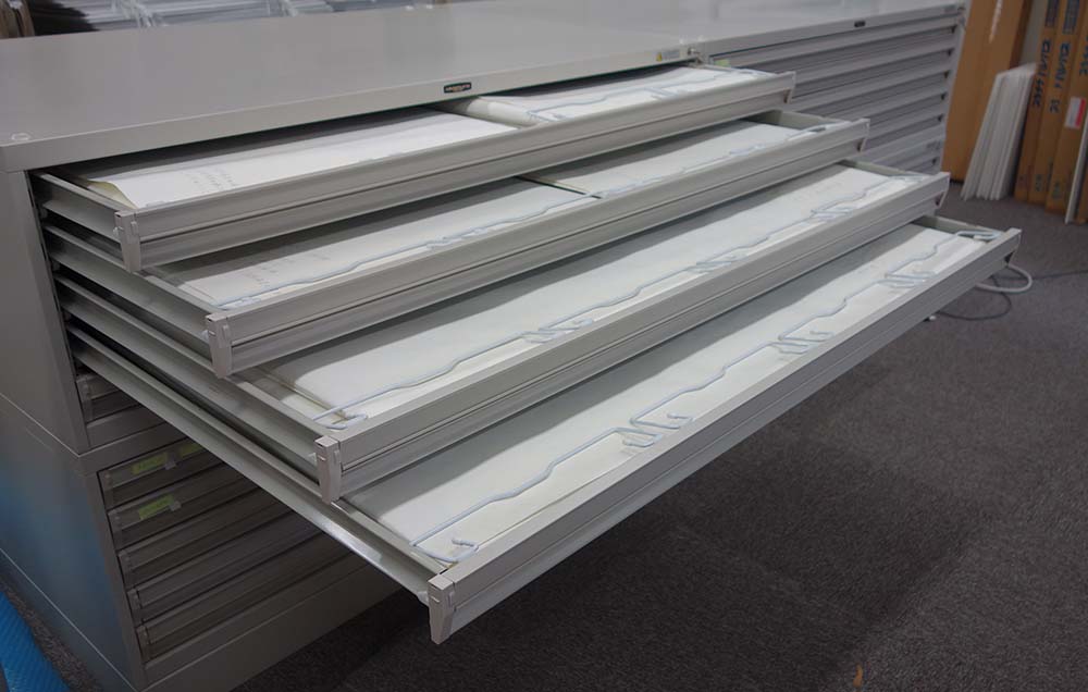中性紙フォルダをマップケースに収蔵した状態その他、建築資料にはスケッチや写真のネガ・ポジ、マイクロフィルムなどのフィルム資料、製本された図面や書類、事務所の文書資料なども含まれます。これらもそれぞれに違った適切な整理・保管方法がありますし、記述内容も変わってきます。アーカイブ機関の場合、多様な資料を全て1点1点博物館の収蔵品のように記録・管理することはしていません。何しろ、大髙資料の場合は図面だけで4万枚近くあるのです。どの資料をどこまで整理することが適切か判断して早期に活用への道を開くこと、それがアーキビストに求められる職能でしょう。図面の場合、まずは群として情報をとり、閲覧請求に応じて整理を進めて行くという運用も考えていかねばなりません。