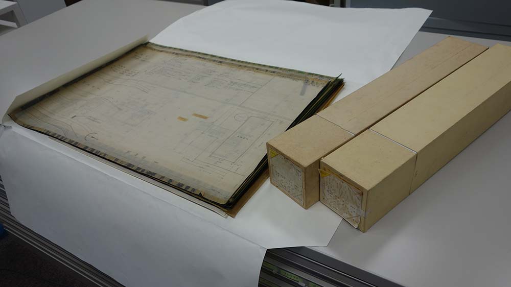 目録をとり終わって図面の内容を把握したら、デジタル化をする場合もあります。デジタル化の目的は、主には資料保護のためです。デジタル技術が今程発達する前から図面資料を保管している組織では、使用頻度の高いものから優先順位を決めてデジタル化を行っていました。しかし、大判のスキャナが登場し、デジタル化の価格も下がってきたこの頃では、資料整理の前にまずデジタル化するという選択をする場合もあるようです。確かに、デジタル化した画像を基に目録化を行って整理を進めることには、資料保護の観点からみても、利点はあります。閲覧も簡便に行うことができます。ただし、データができてしまうと1点1点についてのメタデータが必要になってきますし、データの管理も考えなくてはなりません。現物が存在する以上は、画像と原物の紐づけも必須です。以上のことを考慮した上で、デジタル化の方針を決めるのがよいでしょう。デジタル化後に、現物を廃棄してしまうこともあると聞きます。過去にはマイクロフィルムを撮ったら現物を廃棄している例もありますし、現物を維持するのは大変ですから、廃棄することを簡単に責められはしません。しかしデータの確実な保存方法が確立されていない段階では、デジタル技術を過度に信頼せずに、大切な資料はなるべく現物を維持するようにしたいものです。