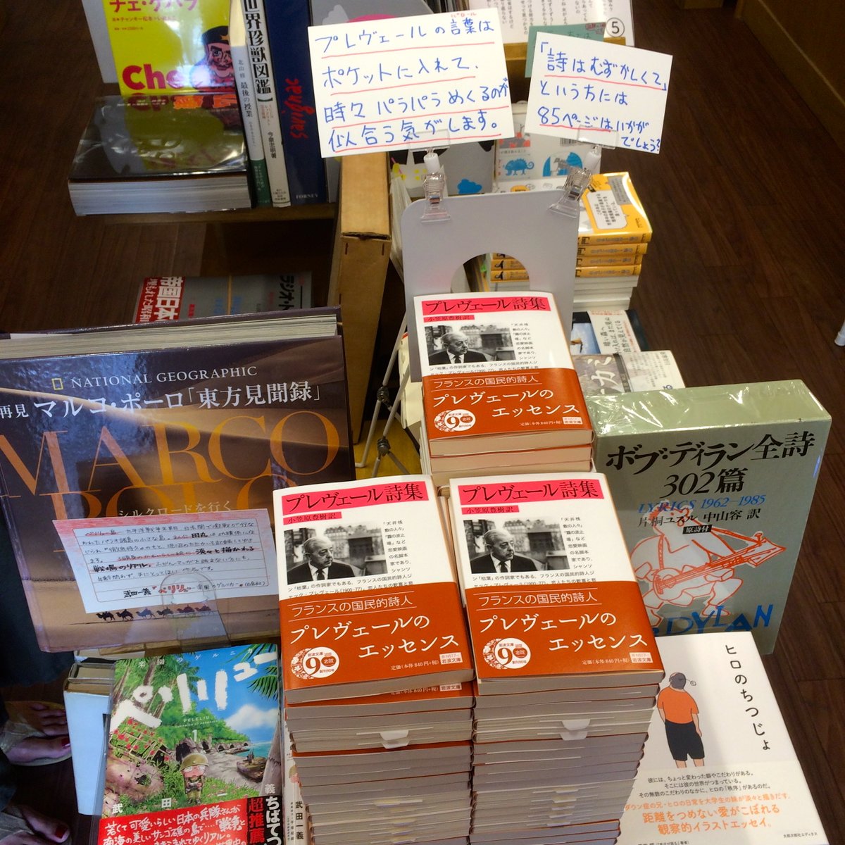 「詩はトイレットペーパーに書くんだ」と言っていたというプレヴェールにふさわしい文庫版です。しかも名訳の誉れ高い小笠原豊樹訳。感極まって口走った「100冊仕入れます」を実行した売場の写真をご覧ください。>