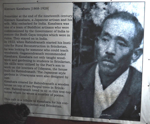 こうして進んでいった家づくりであるが、実はもう一つの背景がある。シャンティニケタンは、詩人ラビンドラナート・タゴールが20世紀初頭に学校を創設した場所であることは先述の通りである。その学校には国外からも多くの指導者が集まり、日本からは仏教家、柔道家、そして芸術家といった様々な人間がその地を訪れた。岡倉天心もまさにそのころ都市カルカッタに滞在して『The Ideas of the East(東洋の理想)』を執筆し、シャンティニケタンでタゴールにも会っている。そしてシャンティニケタンを訪れた日本人の中に、カサハラ・キンタローという一人の大工がいた。彼の目的は、釈迦の悟りの地として知られるインド北東部の聖地ブッダガヤの修復とその調査であったが、道中のシャンティニケタンに立ち寄った。当時タゴールは周辺農村の自立復興のため農村の人々に木工技術を教えることのできる人間を探しており、カサハラが抜擢された。彼は木工だけでなく日本の庭作りも教え、タゴールの家にはカサハラによる内部造作と日本庭園が残されている。また郊外の森の中には瞑想のためのツリーハウスが建設されている。