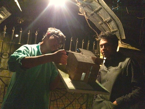 1模型を眺める施主のNilanjan氏と現地建築家のMilon氏。