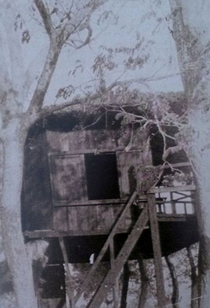4シャンティニケタン郊外の森の中にカサハラが建設したツリーハウス。タゴールがしばしば瞑想の場所として使っていたという。ぼやけた写真であるがよく見ると幾つかの木組みの工夫がなされている。(写真:『Architecture of Santiniketan』より抜粋)