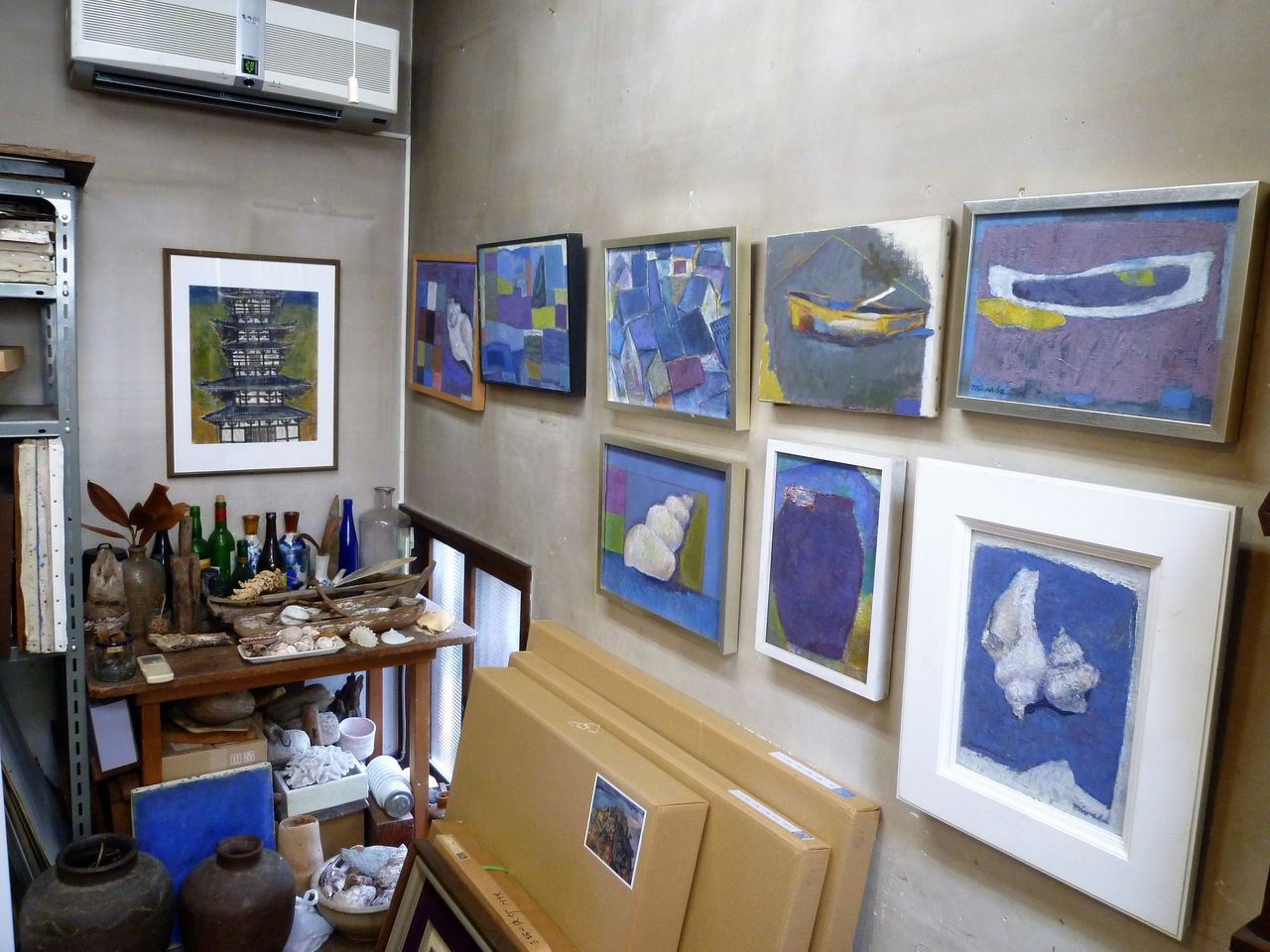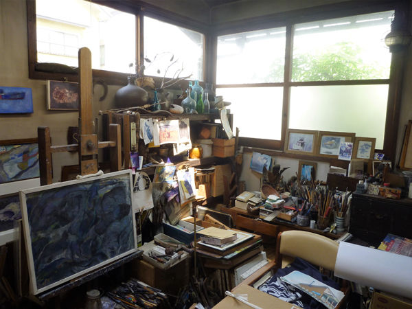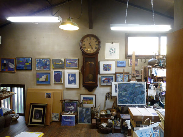 アトリエに入ると正面の大きな掛時計が目に付くが、昔測候所で使われていたものだそうである。描きかけの絵やモティーフとなる静物の類が所狭しと置かれ、ここで画家は日々思索を重ねながら制作されているのだろう。