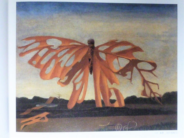しかし、意外にも瀧口から「君の絵はルネ・マグリットのようだ。」と言われたそうである。たしかに大地に屹立する大きな蝶を描いた「風景」と題する作品は、「だまし絵」のように見える。蝶の翅は朽ちた葉であり、胴体は蓑のようで、左前方に落ちている翅の破片はまるで飛行機の残骸を想わせる。本人は、「アトリエから見た吉祥寺の景色に、ここに偶然蝶を置いたらどうなるだろうという発想。背景は常に身辺的風景ですが、非合理的な世界をきちっと見せたいという気持ちでした。」と語っている。この作品は「急速に戦時体制へと傾斜していく時代のなかで抑圧され、傷ついていく前衛美術そのものを象徴しているかにみえる。」(大熊敏之「日本超現実主義絵画にみる蝶と貝のモティーフ」蝶の夢・貝の幻1927~1951展・三岸好太郎北海道立美術館1989年)と評されるなど、日本のシュルレアリスムの代表的な作品としてしばしば取り上げられることになる。