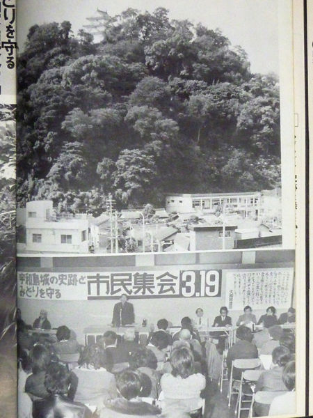 城山と「緑を守る会」マイクの前に立つ三輪田先生(季刊えひめ)