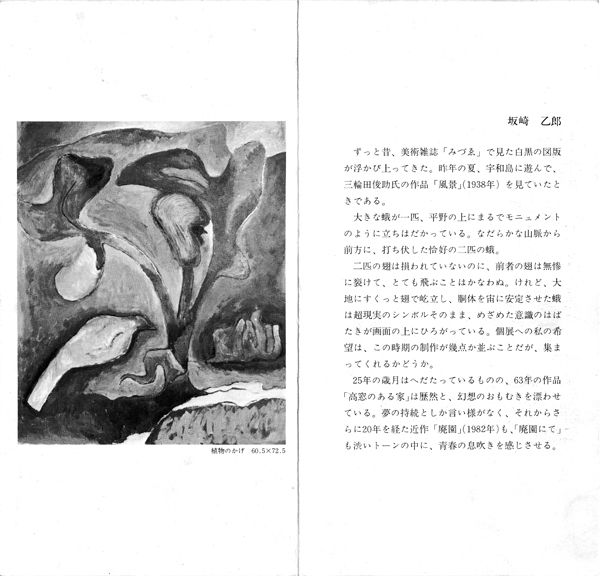同展カタログ表紙「植物のかげE」1989年作そして、展覧会の感想のつもりで書いた文章を先生が愛媛新聞社に紹介し、それが展評として掲載されることになったのである。そのなかで私が言いたかったのは、先生が一貫してシュルレアリスムの精神を持った画家であり、単に「土着の画家」と呼ばれることに異を唱え、優れた画家は住む場所がどこであれ、自然や人間の営みのなかに潜む宝(本質)を見出し、普遍性に達する表現ができるということだった。先生自身も画業を振り返って「風景と自分との関係性というか、無意識の世界を引き出して行く感じです。それはつまり、シュールレアリスムの発想。要するに六十年たって、手法は違うけど、らせん階段を上がるように元のシュールに戻って来たんだね。」と語っている。