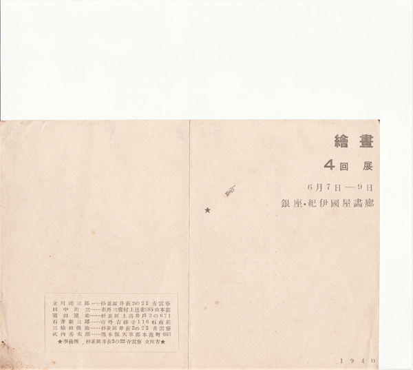 同上カタログより「繪畫」としての活動は1940年6月の第四回展をもって終わり、やがてグループも解散するが、1941年6月には杉並署に拘留されていた瀧口のもとへ仲間の浜田、立川と一緒にお金を出し合って果物の差入れをしたこともあったという。卒業後は「旬刊美術新報」の編集の仕事に就くが、1942年に応召され徳島連隊で三年間を過ごし終戦を迎える。