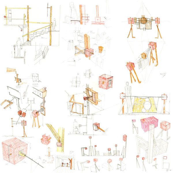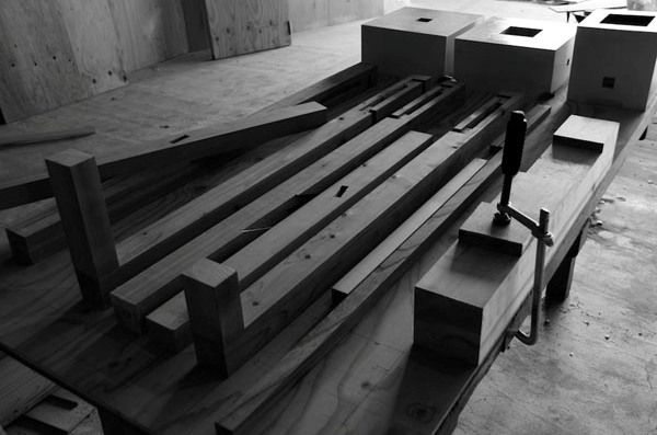 先月、東京・北千住のある建設現場の中の一画を占拠して、このシャンティニケタンの家作りの準備をしていた。北千住の現場も、比較的規模の大きいコンクリート躯体に対して新たに木工造作を挿入する形であり、その現場での作業から様々なアイデアが飛び火してくる。主に家具についてのアイデアを思いついたので、早速、大工・青島にそのプロトタイプを制作してもらった。それぞれの家具が備えている赤い小さなキューブは、日本から道具、あるいはお土産まがいのエレメントを詰めてインドに持っていくための梱包箱である。そしていくつかの脚部材も日本から持ち込み、ノックダウン方式で、その箱と共に現地で家具として組み立てようとしている。現地ではさらにインドの溶接工に依頼して鉄部材を用意してもらい、木工家具とドッキングさせる。異なる作業段階の時間的な偏差と、長距離移動の手間が、このプロジェクト自体の根拠となっており、また創作表現の基軸を担う。私自身がインドにこだわって滞在と移動を続けているのは、そんな表現の可能性を確かめたいからである。