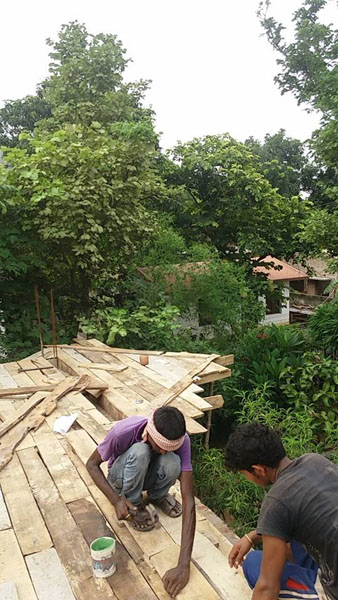 自分自身の移動の径を一つの物語として建築の中に架構するとは、つまるところ、そんな長らく続く建設過程における幾つかの要所となる段階で、自分がインドにいるべきか、日本にいるべきかを定めながら、プロジェクトを進めていこうということである。さらには、日本から自分に限らず、友人の大工・青島雄大、そして幾人かの作り手と共にシャンティニケタンの現場へ向かい、工事を協働する。建築はあくまでも実体のものであるから、”日本の家”なるものをインドで作って見ようとする時点で、何らかの折衷、あるいは並存の状況が現れることは間違いない。ならば変に取り繕うのではなく、両者が並存する舞台をいくらかの時間的尺度を備えて設えてみようとしている。