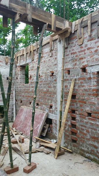 171004-2現場写真。梁の型枠を支える支保工は竹とレンガブロック。