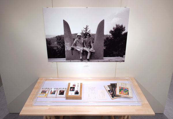 会場風景-2(写真はクレタ島クノッソス宮殿の「牛の角を象った玉座」に腰掛ける堀内誠一と澁澤龍彥【撮影:澁澤龍子】。この展覧会のシンボル・イメージである。ケース内は『血と薔薇』のオリジナル、復刻版、文庫版および、澁澤から堀内への責任編集者辞任の通知と詫び状)