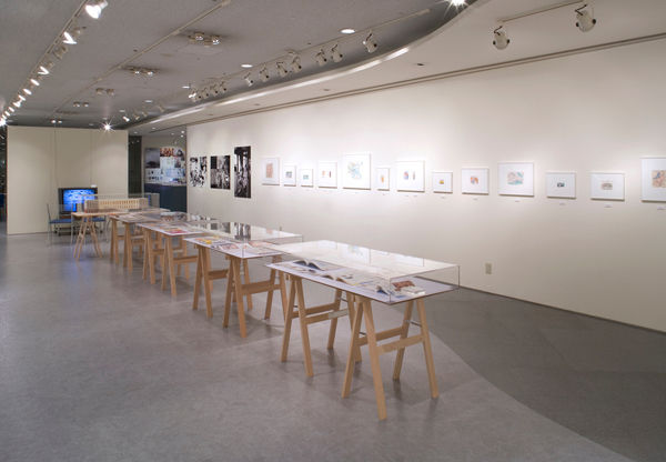 写真は旅先で龍子さんが撮ったもので、オリジナルプリントの額装、拡大したデジタルプリントのパネル装、テレビ画面のスライドショーという3種類の展示方法を採用した。イラストレーションはすべて額装して壁面に展示し、関連書籍はアクリルケースに入れてテーブルに乗せた。加えて二人の対照年譜を掲げ、足跡をたどることができるようにした。