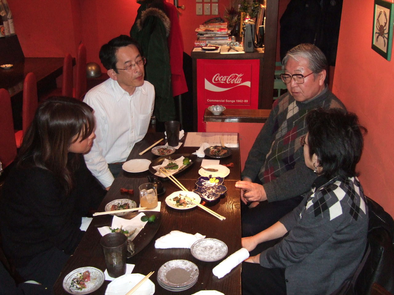その夜の二次会、近くの居酒屋さん「机」にて。左から尾立麗子、三上豊さん、細江先生、社長