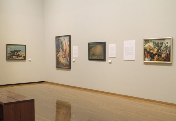 展示室入口。本展の開催動機ともいえる、郷土作家の福沢一郎(1898-1992)の存在は大きく、福沢と同世代の画家に着目し、特に1920年代後半から30年代後半にかけての作品に見受けられたシュルレアリスムの表現に注目している。