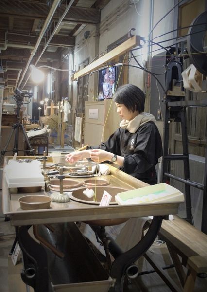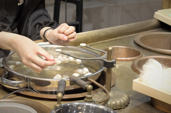 フランス式繰糸器(復元)の展示と実演の様子。繭をお湯で煮てほぐれた一本の糸口を見つけ出し、機械で巻き取っているところである。繊細で髪の毛よりも細い糸を扱うため、女性の小さい手の方が向いていたのだろう。