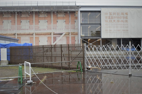 こちらは、西置繭所の保存修理を見学できる施設である。ヘルメットを借りて、内部に入ることができる。私が見学したときは、素屋根の解体中であった。修理の様子は、行く時期によって変わるようである。滅多に見ることのできない特別な瞬間をぜひとも見学していただきたい。