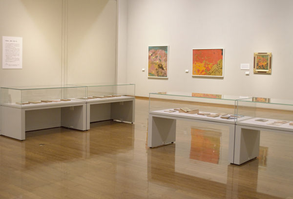 福沢一郎記念美術館は同じ建物内にあり、「特集展示 福沢一郎と『本』」と「福沢一郎 物語を描く」が開催されていた。画像は、覘きケースに福沢一郎が手掛けた装丁の図書や雑誌類が展示されている風景である。福沢一郎は富岡市出身であり、1991年93歳にして文化勲章を受章するなど、生前から評価が高かった。そのため、福沢一郎の画業を顕彰し、未来へと作品を引き継ぐ方法として、美術館博物館建設の構想中に個人記念館も設置された。このような複合施設は、今ではそれほど珍しくない空間設計ではあるが、開館した1995年においては画期的な試みであった。創立から20年以上経った今では、認知度も高まり、福沢一郎の作品に関する相談を受けるようになったという。個人の美術館として、アトリエを改装した「私立」が多い中で、「公立」の施設は、長期的な作品の維持管理を考える上では理想的といえる。