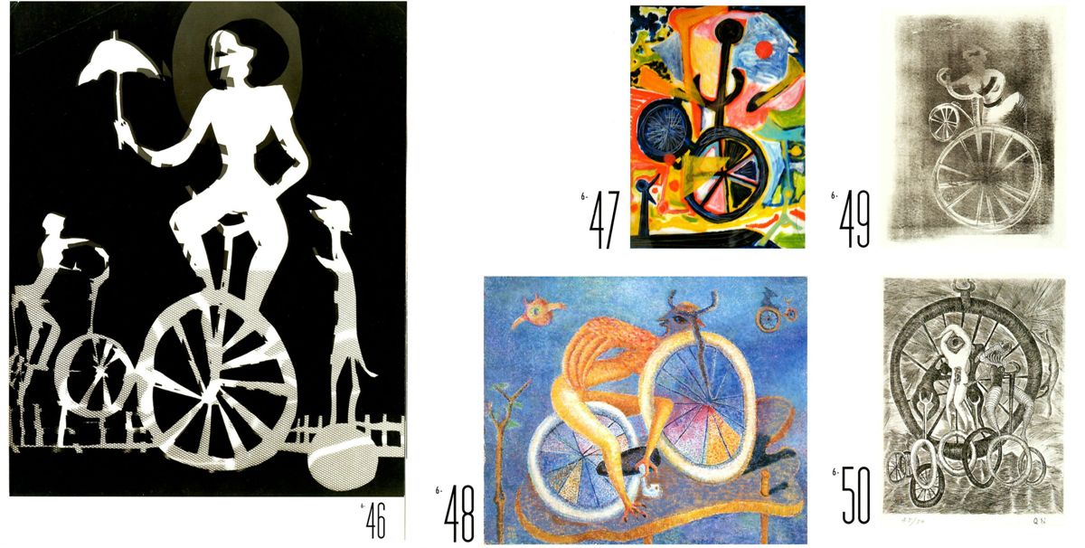 画像は、2011年に行われた展覧会『生誕100年記念 瑛九展』(宮崎県立美術館、埼玉県立美術館、うらわ美術館)の図録に掲載されている自転車やサーカスに着想を得た作品群である。※ No.6-46《自転車にのる女》、No.6-47《(題不明)》、No.6-48《自転車》、No.6-49《自転車のり》、No.6-50《サーカス》