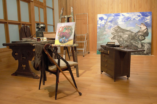 こちらは、福沢一郎のアトリエを再現した展示スペースである。戦前から使用されてたイーゼルには、あちこち油絵が付着している。後方の昇降台は、大型の作品制作の時に使用していたようだ。隣には、1992年の絶筆とされる作品が置かれている。