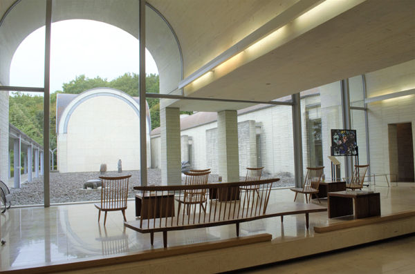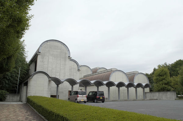 一面灰色の空から出現したかのような雲形の屋根を持つ建物。聞くところによると、富岡の山(建物のある地形)から着想を得て設計されたという。特徴的な建物であることから、建築を学ぶ学生たちが見学に訪れることもある。設計は、東京都現代美術館の設計も手掛けた建築家柳澤孝彦(1935-2017)である。
