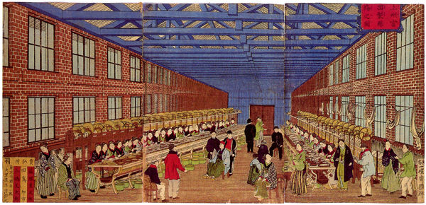 製糸場の浮世絵が制作されている。20名ばかりの女性が横並びでフランス式の機械を操る様は、たいへん珍しい光景であったと思う。女性の表情や顔の向きはバラバラであることから、隣の人と会話をしたり、仕事ぶりを見に来た男性の事を噂したりしているのかもしれない。一曜斎国輝《上州富岡製紙場之図》明治5年(1872)頃(富岡市立美術博物館編「錦絵にみる器械製糸―美術博物館の収蔵品から」より)