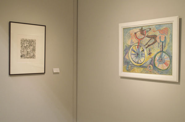 画像は、瑛九の作品《曲乗り》(1955-56年、油彩・カンヴァス、60.5×73.0)および《母》(1953年[1974年刷]エッチング・紙、29.3×24.0)である。《曲乗り》の大きな車輪の下には、「Q.Ei 55-6」という書込みがある。前者のタイトルである《曲乗り》は、自転車にまたがり曲芸を披露する人物と考えられ、回転する車輪を象徴するような同心円が背景に描かれ、サーカスの高揚感が色彩で以て表現されている。多くのシュルレアリストにとって、サーカスは格好の題材として取り入れられていたが、具体的に新聞やサーカス史を調べてみると、戦前から戦後に掛けて様々なサーカス団が技を競い合っていた時期と重なっていることが分かる。ただの想像や模倣ではなく、実際に実物を見てからイメージを変容していった可能性も否定できないのである。大正2年頃には、自転車がサーカスの演目に加えられていることが、新聞などから辿ることができ、特に「日本アームストロング」という団体は、海外遠征をするほど躍進を遂げていたことが先行研究で明らかになっており、自転車5人曲乗りや一輪車の曲乗りが披露されていた(阿久根巌「木下サーカス草創期の記録を探す」『木下サーカス生誕100年史』2002年)。また、作品が制作された前年1954年については、木下サーカス団が丸テントを設置する興行スタイルをはじめた年であり、一般層も気軽にサーカスを観覧できるようになったと考えられ、新聞などではサーカスに関するニュースが度々報じられた。