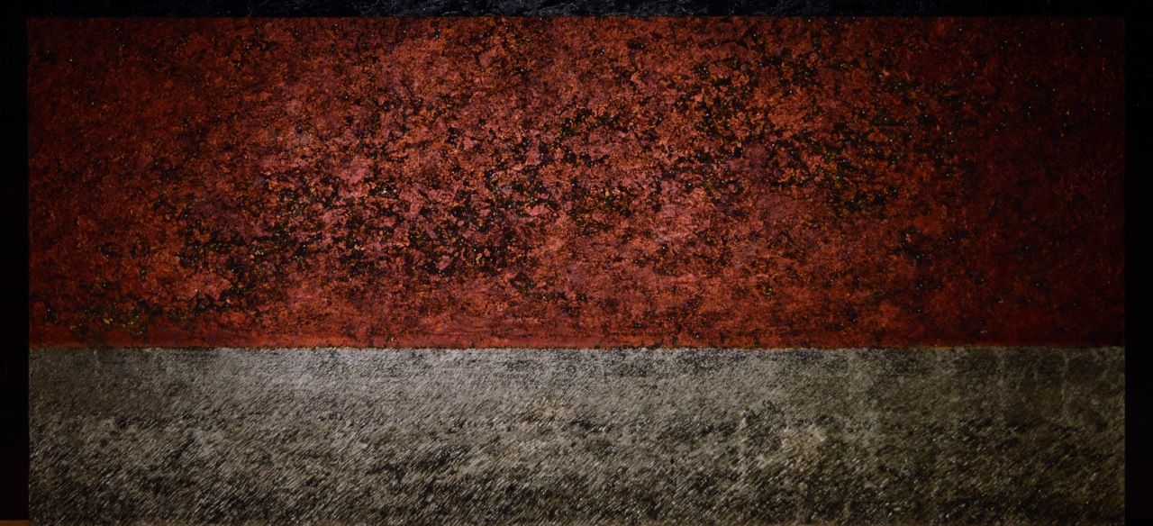 次に、銀の草原と赤い空の作品(65.2×140cm)も完成、これは現実的な風景ではなく、今まで銀色の草原を描いた絵は全て同じ場所で、自分の心の中にある、一人で休んだり考え事をしている場所の風景で、その時の気分で空の色が変わります。