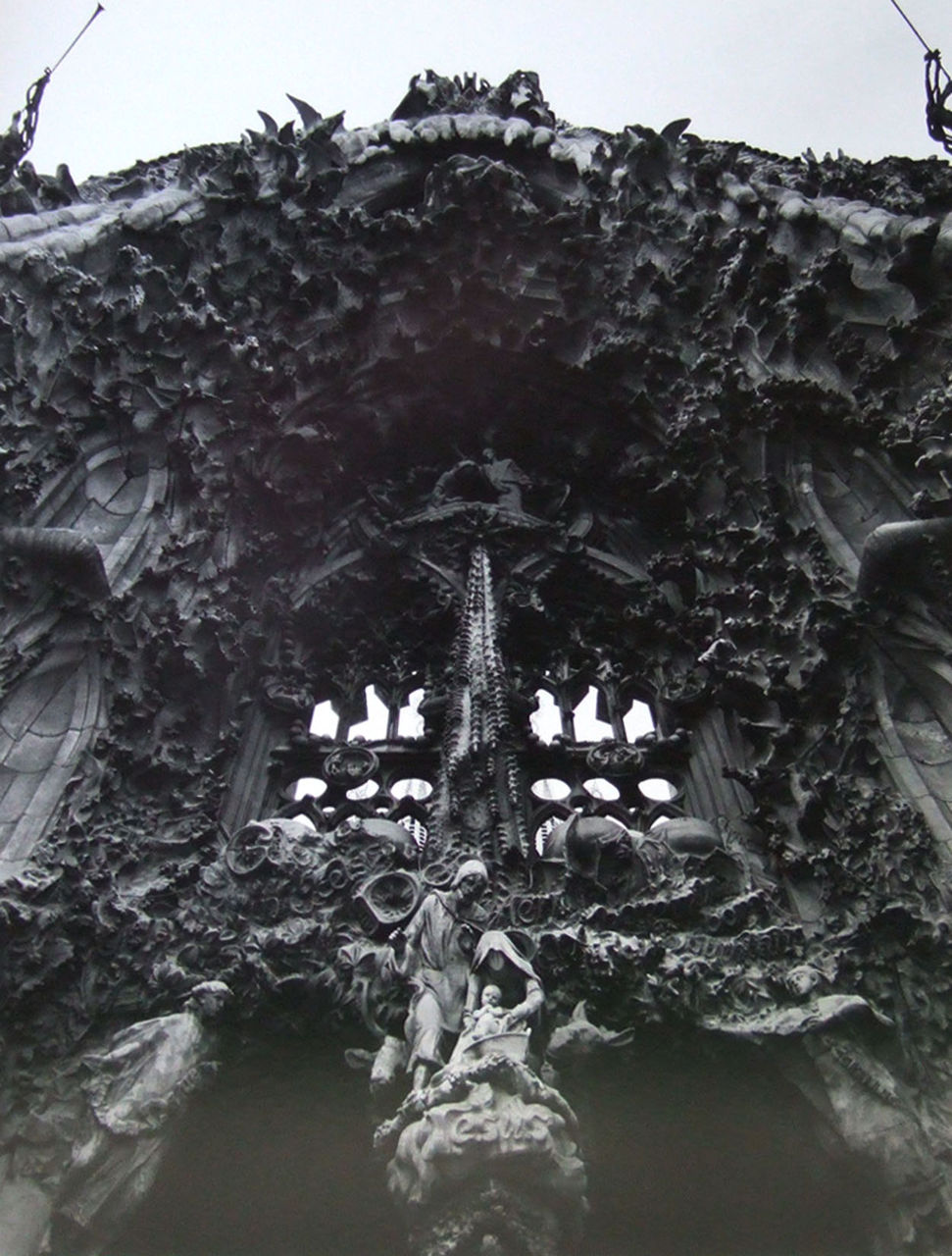 本格的な撮影を始めたのはそれから13年後の1977年の2月からである。「ガウディ」に関する多少の学習とカメラの重装備をしてまず訪れたのはサクラダ・ファミリアだった。用心深く近づいてカメラを向けたものの、巨人「ガウディ」の皮膚は分厚くて内部に立入る隙を見つけることができなった。少しばかり勉強したかといって、そんな知識は何の役にも立たないことが分かったし、それよりも中途半端な知識は、逆に「ガウディ」について自由なモノの見方や直感の妨げになるばかりだと気づいた。>