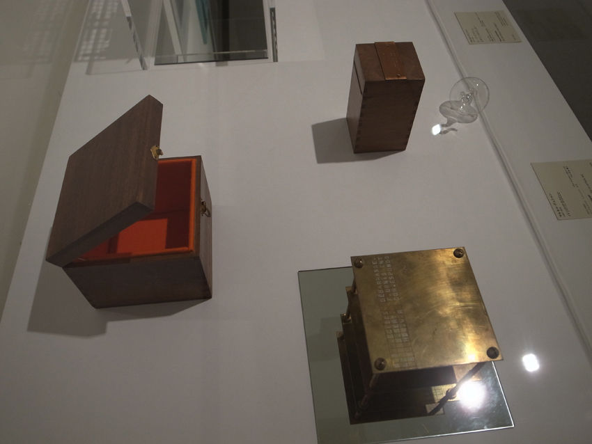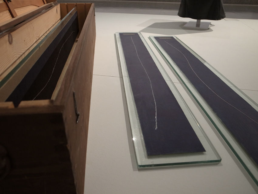 それにしても、今回のベサン・ヒューズが、示したインスタレーションは、観客も彼女と共に、「迷宮で」デュシャンを楽しむ仕掛けに満ち、前3回の展示と比べて『泉』を身近に感じた。展示台に置かれたレディメイドも接近可能な状態であり、カメラ片手に盗撮に近い気分(したことはありません)で、『旅行用折りたたみ品』(1916年)や『三つの停止原基』(1913-14年)を覗いた。美的な意味を解釈してはいけないそうだけど、美しいのだから仕方がない。加えて、今回の展示でわたしの心が一番騒いだのは、レディメイドが入っていた木箱の意匠。初めて覗いた『秘められた音で』(1916年)の、内貼りのオレンジ色がエロティック。この色、平安神宮の大鳥居に続いてないかしら