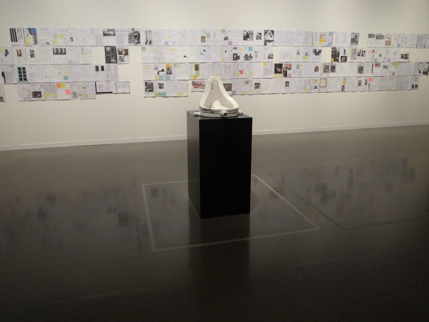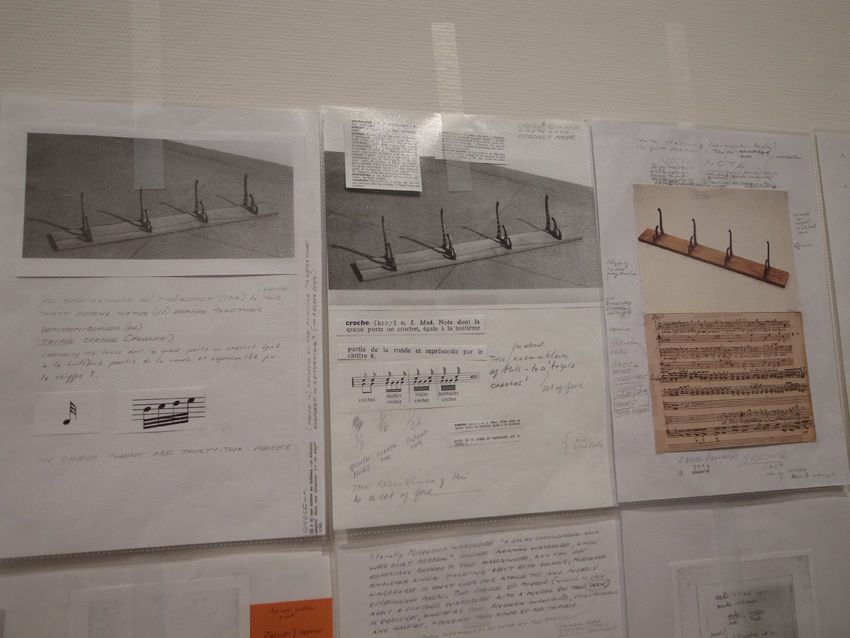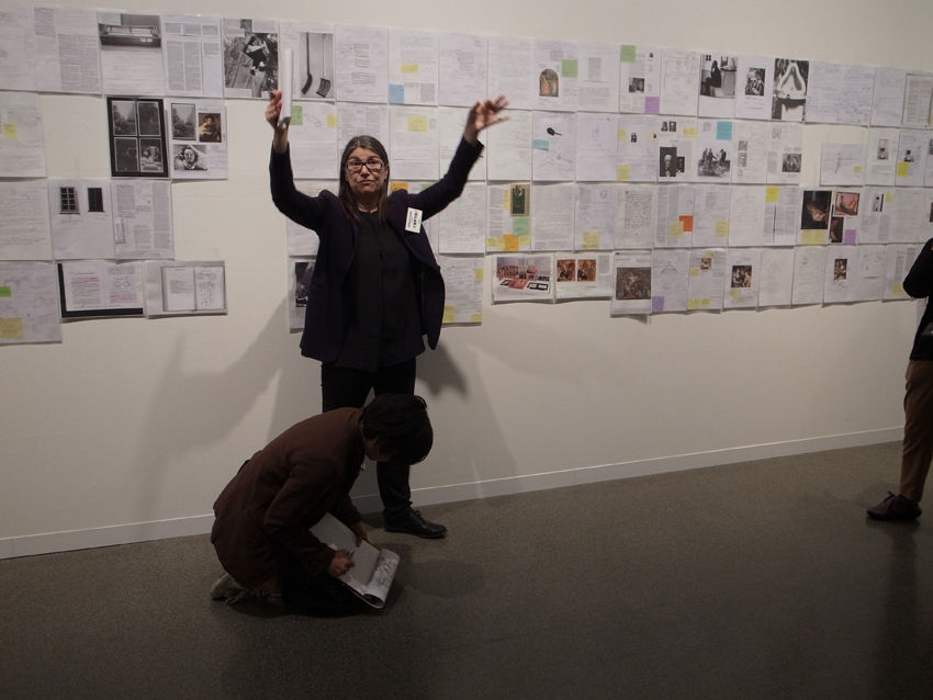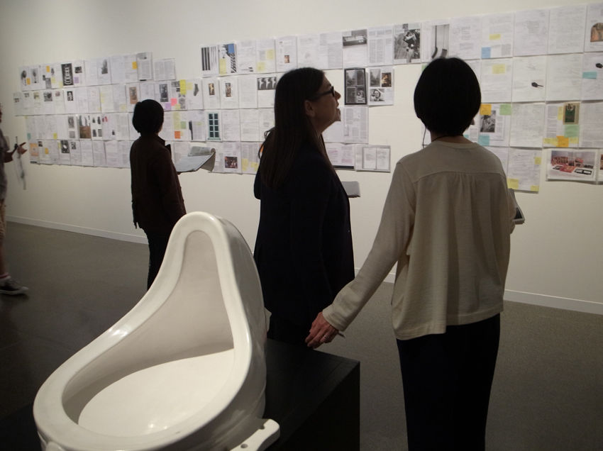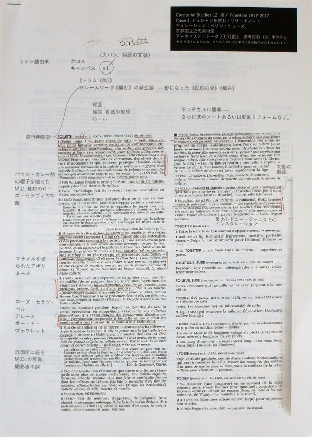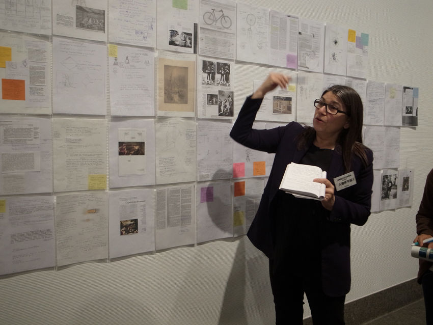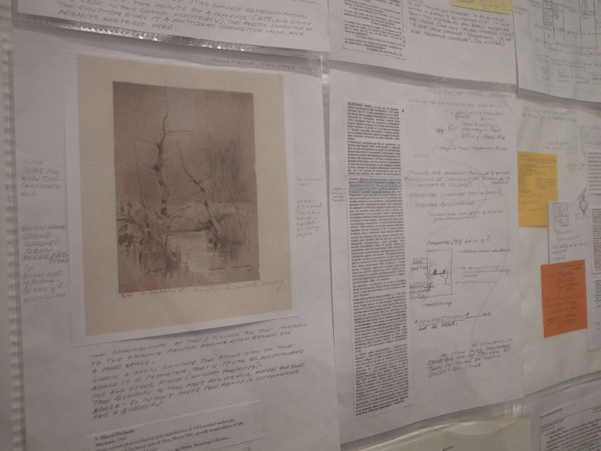 彼女が2007年から始めた『デュシャンを読む: リサーチ・ノート』のプロジェクトは、作者だけでなく、観る者によっても作品が作られると云うデュシャンの言説に触発されたようで、興味深い。美術館の壁面を埋め尽くしたベサンのA4シートはおよそ700枚。様々な写真や資料、書籍のページをコピーして余白に書き込んだ思考の痕跡が、仏語と英語の間を行き来し、メモ的なデッサンや所々に貼られた各色の付箋、新しいA4シートへと続く解釈が、さらに核心へ迫るのか? デュシャンの回りで溺れるのか? これに立ち入ろうとしたけど、日本語世界のわたしには難しい。美術史家や評論家、哲学者や収集家といった分類に属さず、デュシャンと同じ意味での美術家によるアプローチは、ファイルに入って、無造作に留められたA4シートのように美しい── で、どうして、彼女はデュシャンの虜になってしまったのかと26日のアーティスト・トークに参加しながら考えた。