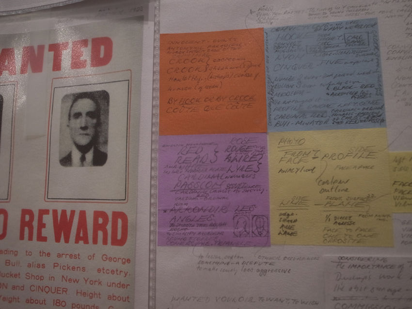 Bethan Huws著『Research Notes』(2014年刊)の『貞淑さの楔』掲載頁(343)、アーティスト・トークの会場で、直接、「デュシャンと色」との関係を尋ねてみれば良かったのだけど、機会を逸してしまった。後日、再訪した折『お尋ね者』(1934年)からの付箋紙で「RED / READ」から「ROSE / ROUGE」へと繋がる単語を読んだ。デュシャンと言えばグリーンだと単純に思っていたけれど、『お尋ね者』での色使いの為か、「赤」から「読んだ」が連想され、さらに、寓意に満ちた「薔薇」「口紅」へとデュシャンをリサーチするベサン。「READ」は、彼女にとって特別の、意味ある動詞のようで、過去の作品でも重要なモチーフになっている。「READ」は、過去形も「READ」と綴り、発音が「RED」になるのは、よく知られている。デュシャンを読むと、木々の葉は赤く色づき、やがて風に舞って、足の周りに落ちてくる。寒暖の差が激しい不安な世界、美術館の壁面を埋め尽くしたベサンのA4シートが、どのように落下するのか? 襟を立てながら待っていたい。