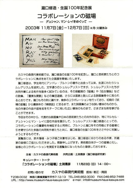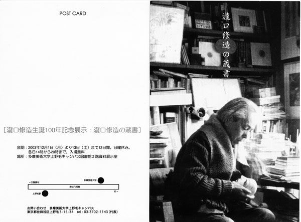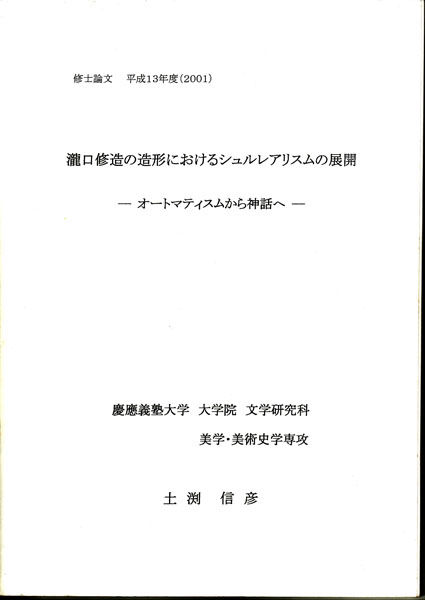 土渕さんの修士論文2003年には瀧口修造生誕100年を記念した催しや企画が行われ、横須賀市のカスヤの森現代美術館では「コラボレーションの磁場―デュシャン、マン・レイをめぐって―」(共同企画:土渕信彦)と題して瀧口が関わった詩画集やマルチプルなどの展示があり、多摩美術大学上野毛キャンパス図書館では「瀧口修造の蔵書」展もあった。また、富山県立近代美術館から「写真家・大辻清司 フレームの中の瀧口修造、斎藤義重」という珍しい写真を収めた小冊子が刊行されている。「現代詩手帖」誌も生誕百年記念の特集を組んでいたが、従来の瀧口特集を踏襲したような内容で物足りない印象は拭えなかった。