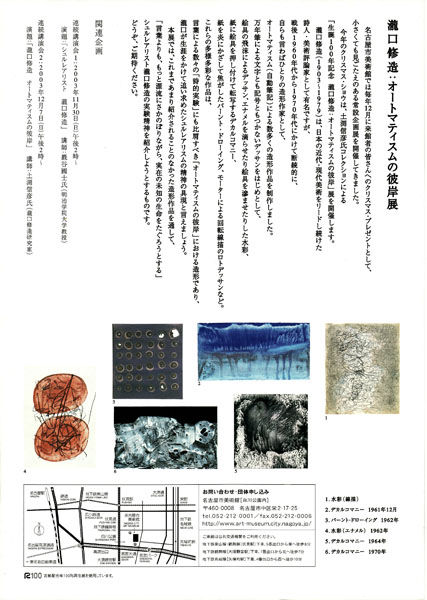 「現代詩手帖」2003年11月号そして、名古屋市美術館では土渕コレクションによる「瀧口修造:オートマティスムの彼岸」展が開催され、11月30日の巖谷國士さんの講演に合わせて名古屋へ向かった。美術館の控室で俳人にして美術評論家の馬場駿吉さん、当館学芸員の山田諭さんに初めてお会いし、そこには石原輝雄さんや光田由里さんも同席されていた。質量ともに屈指の個人コレクションで、単に集められたものではなく技法に沿って系統的に選ばれた瀧口の造形作品67点と自筆原稿3点による見応えのある展示だった。