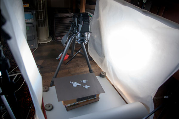 <写真2 踊り子たち複写の様子>撮影時の二重露光の方法では、「顔アップ」の写真を複写した後、フィルムを巻き上げずにそのまま「踊り子たち」のコラージュを複写します。
