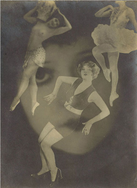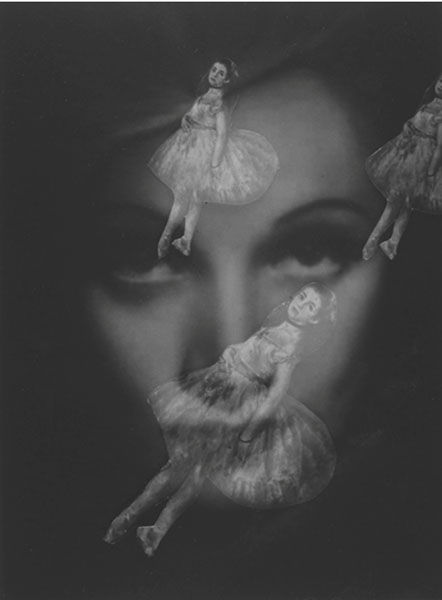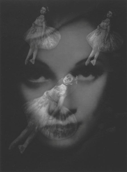 撮影時の二重露光の方法では、「顔アップ」の写真を複写した後、フィルムを巻き上げずにそのまま「踊り子たち」のコラージュを複写します。