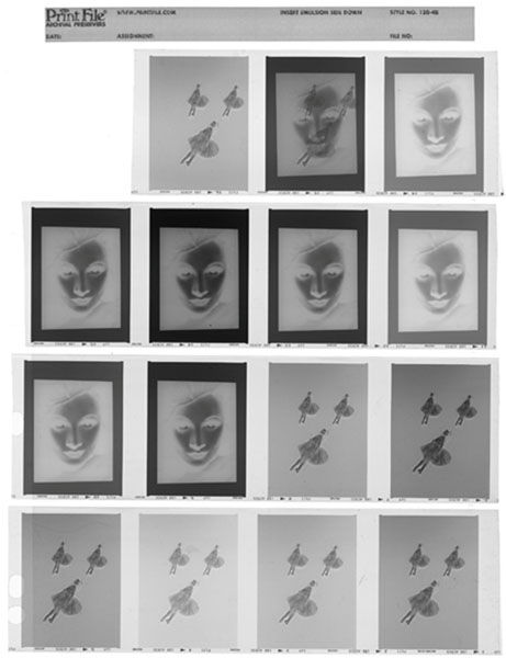 これに対してプリント時のネガの重ね焼きでは、「顔」と「踊り子たち」を別々に複写します。その際に露光を変えて何種類かのネガを作っておきます。ネガシートの二列目以下がその結果です。