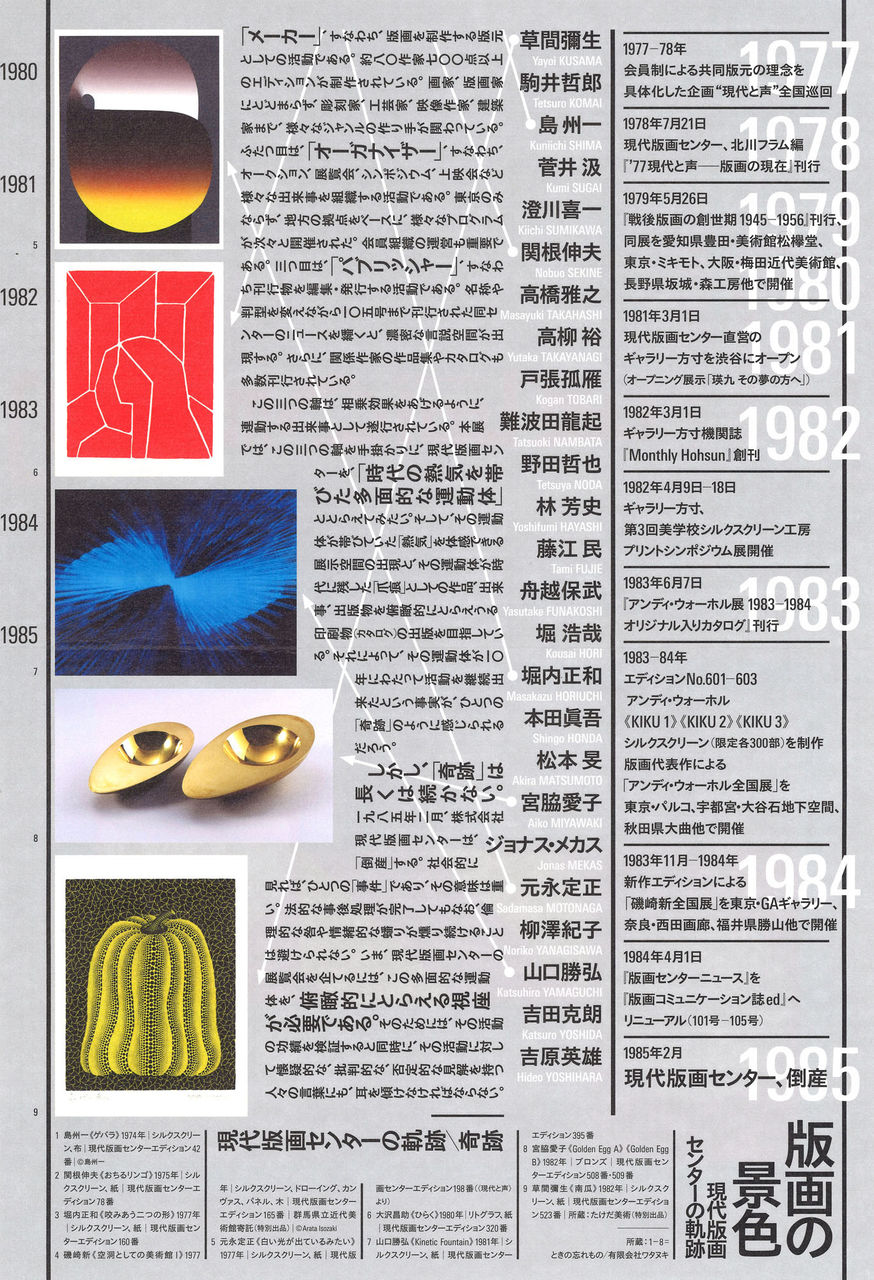 【出品作家 45 名】靉嘔/安藤忠雄 /飯田善国/磯崎 新/一原有徳/アンディ・ウォーホル/内間安瑆/瑛九/大沢昌助/岡本信治郎/小田 襄/小野具定/オノサト・トシノブ/柏原えつとむ/加藤清之/加山又造/北川民次/木村光佑/木村 茂/木村利三郎/草間彌生/駒井哲郎/島 州一/菅井 汲/澄川喜一/関根伸夫/高橋雅之/高柳 裕/戸張孤雁/難波田龍起/野田哲也/林 芳史/藤江 民/舟越保武/堀 浩哉 /堀内正和/本田眞吾/松本 旻/宮脇愛子/ジョナス・メカス/元永定正/柳澤紀子/山口勝弘/吉田克朗/吉原英雄