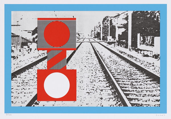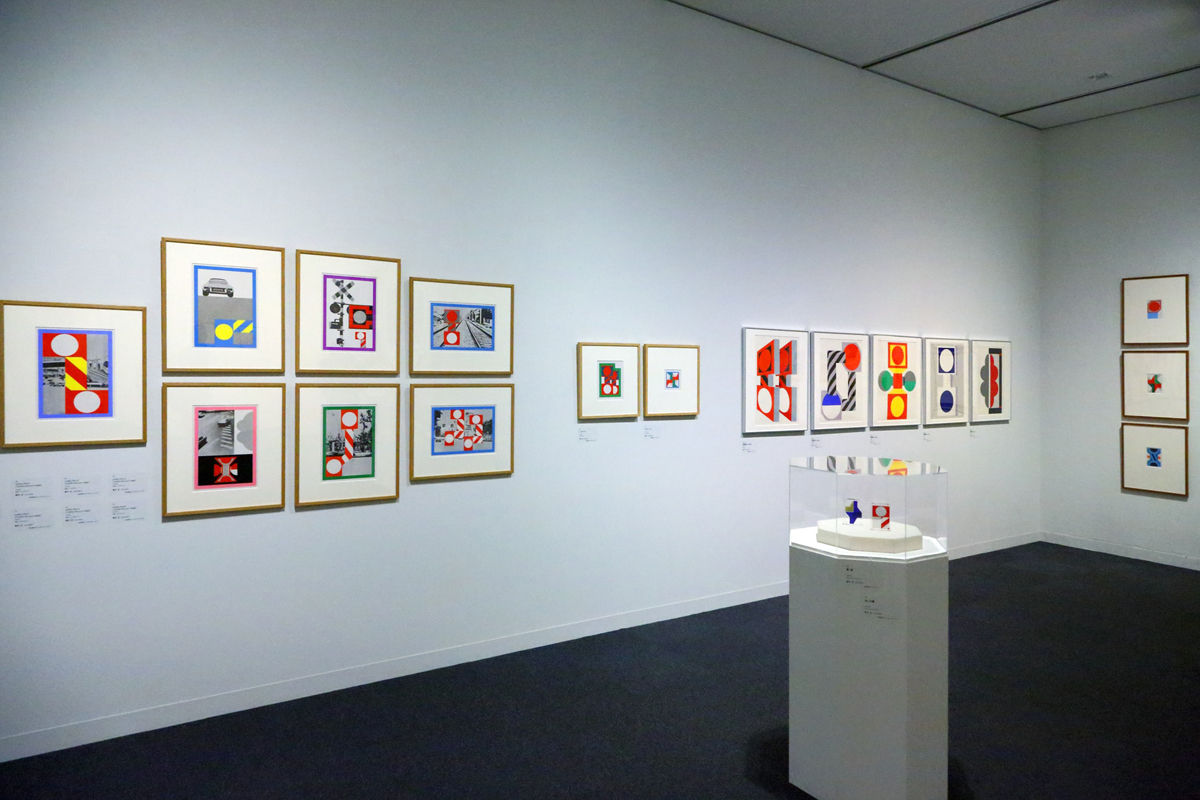 一方菅井は、《スクランブル》と題された7点シリーズがとにかく輝いていた。版画の表現を拡張しているじつに美しい作品群である。木村のそれとは違うものの、菅井の作品にも独特なタッチがあり、圧倒的な強度を獲得している。明確な幾何学と白黒写真によるコラージュという表現の振れ幅の大きさに版画としての魅力があるのだろう。白黒写真は、空間に奥行きを与え、そこにフラットな幾何学を重ねることで、作品に独自の「トーン」がまたここにも出現する。造形と色による見事な対比と調和が見る者の想像力を自由に開放してくれるのだ。
