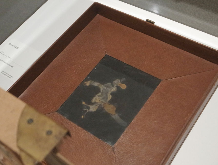 『泉』(手前)──などと感じながら、若い美術家の仕事に包まれ歩いたけど、内実はうわの空だったと告白しておきたい。それは、今回のインスタレーションを特徴づけ、抜き差しならぬ『散種』の概念を撒き散らしてやまない富山県立美術館から貸し出された限定豪華版『トランクのなかの箱』に収められた『罪のある風景』(1946年)が、男性用小便器である『泉』と寄り添うように展示されていた事による。300部程度造られた普及版(『トランクの箱』と称される)の他に、一点毎が異なるオリジナル作品の入った20部(プラス非売品4部)が存在するとされ、会場で対面していたものは、マルセル・デュシャンが愛人であった在米ブラジル大使夫人のマリア・マルティンスに贈った12番本で、奇妙な素描が特別の画材によって描かれている。デュシャンの伝記を著したカルヴィン・トムキンズによると「1989年に行われた化学検査の結果、素描に射精された精液が用いられていることが判明する。」(『マルセル・デュシャン』木下哲夫訳、みすず書房、2003年、362頁)との事で、彫刻家でもあったマリアは、それまでの女性に対する接し方を見失うほどデュシャンにとって特別の存在であったようで、『与えられたとせよ 1.落ちる水 2.照明用ガス』 (通称《遺作》)への導入部にあたるとの説もある。それなので、眼が釘付けになって、いつまでも、いつまでも、執拗に見続けた(写真もたくさん撮った)。本作を富山の美術館にもたらした画商の逸話を聞いているものだから、行き場を見いだせないままの精子が死に絶え、同時に体温も消え失せて、あらぬ風景が固定されていく様子が浮かんで、目眩を覚えるほどの衝撃の中にいる。その場所が《大ガラス》の内側であり、公共の美術館の一室であるのだから、声を大にして、近くにいる男にも女にも、そうでない人にも伝えたくてしょうがない。「綺麗だよね」──もっとも、展示品の素材紹介を「体液」と表記するにとどめざるおえなかったのは、致し方ないとはいえ、残念である。