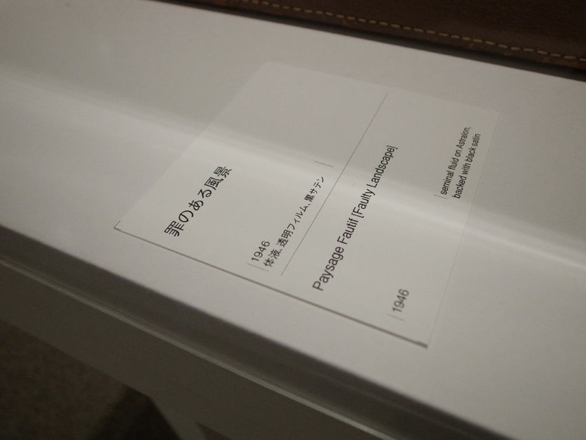 ──などと感じながら、若い美術家の仕事に包まれ歩いたけど、内実はうわの空だったと告白しておきたい。それは、今回のインスタレーションを特徴づけ、抜き差しならぬ『散種』の概念を撒き散らしてやまない富山県立美術館から貸し出された限定豪華版『トランクのなかの箱』に収められた『罪のある風景』(1946年)が、男性用小便器である『泉』と寄り添うように展示されていた事による。300部程度造られた普及版(『トランクの箱』と称される)の他に、一点毎が異なるオリジナル作品の入った20部(プラス非売品4部)が存在するとされ、会場で対面していたものは、マルセル・デュシャンが愛人であった在米ブラジル大使夫人のマリア・マルティンスに贈った12番本で、奇妙な素描が特別の画材によって描かれている。デュシャンの伝記を著したカルヴィン・トムキンズによると「1989年に行われた化学検査の結果、素描に射精された精液が用いられていることが判明する。」(『マルセル・デュシャン』木下哲夫訳、みすず書房、2003年、362頁)との事で、彫刻家でもあったマリアは、それまでの女性に対する接し方を見失うほどデュシャンにとって特別の存在であったようで、『与えられたとせよ 1.落ちる水 2.照明用ガス』 (通称《遺作》)への導入部にあたるとの説もある。それなので、眼が釘付けになって、いつまでも、いつまでも、執拗に見続けた(写真もたくさん撮った)。本作を富山の美術館にもたらした画商の逸話を聞いているものだから、行き場を見いだせないままの精子が死に絶え、同時に体温も消え失せて、あらぬ風景が固定されていく様子が浮かんで、目眩を覚えるほどの衝撃の中にいる。その場所が《大ガラス》の内側であり、公共の美術館の一室であるのだから、声を大にして、近くにいる男にも女にも、そうでない人にも伝えたくてしょうがない。「綺麗だよね」──もっとも、展示品の素材紹介を「体液」と表記するにとどめざるおえなかったのは、致し方ないとはいえ、残念である。