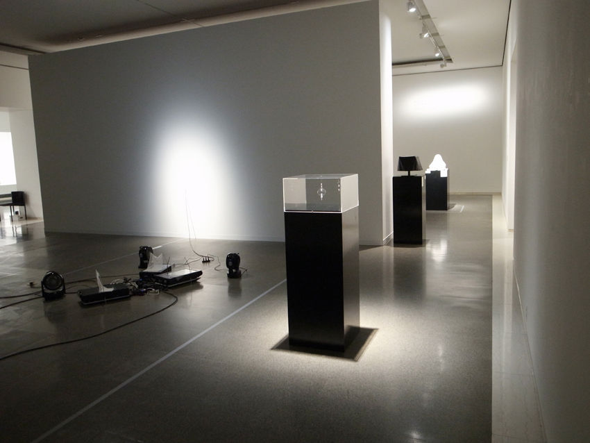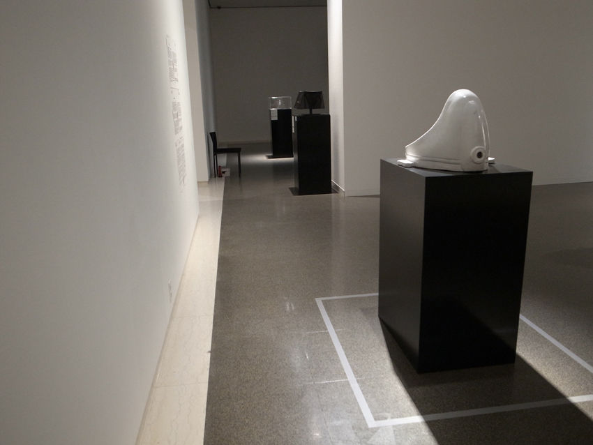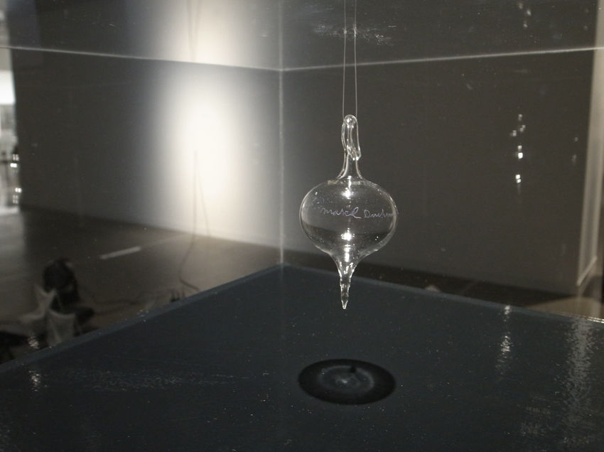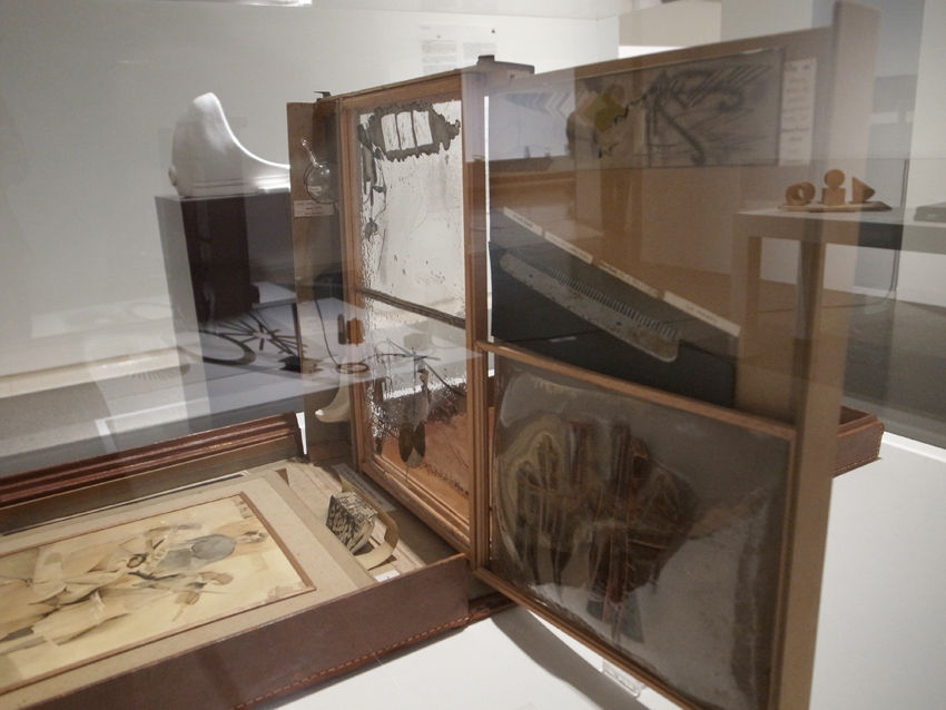 美術館4階最奥の常設展示室を《大ガラス》に見立て、デュシャンが自作品をミニチュア化して詰めた『トランクのなかの箱』の構造を借用しながら、毛利悠子は『パリの空気』『旅行用折りたたみ品』『泉』の3レディメイドを会場に取り込んだ。実際の『トランクのなかの箱』では《大ガラス》の横に上段から「花嫁」<境界線>「独身者」と対応しながら括り付けられている訳だが、重力から解き放し、併置した3点は、どうも、しまりが悪い(これも好き嫌いだけど)。