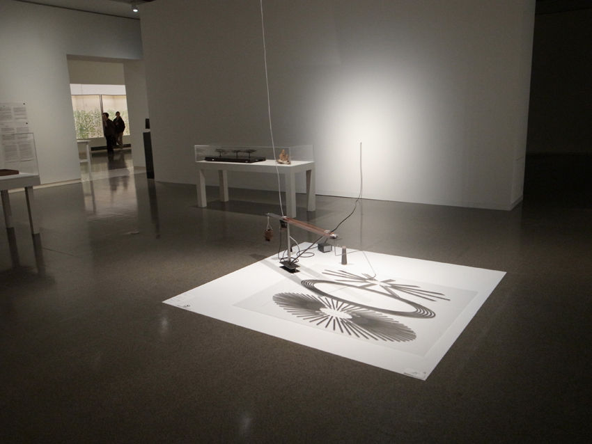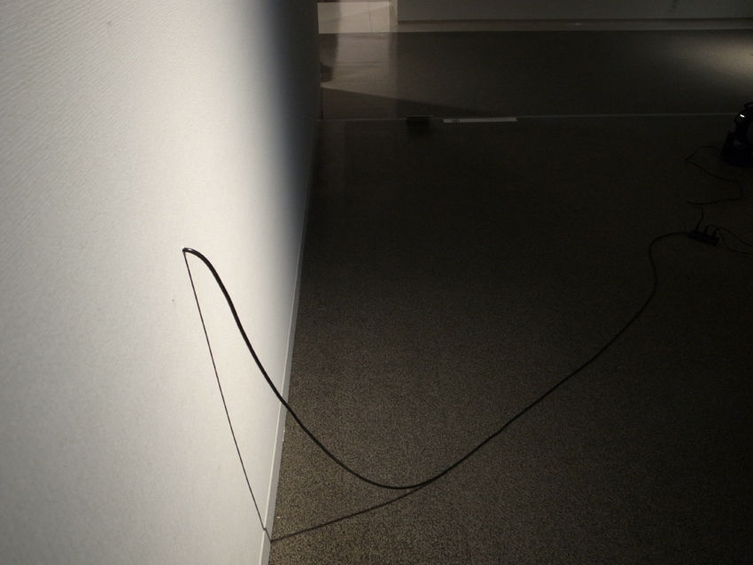 「花嫁」のエリア「日用品と音や光、水などを組み合わせたインスタレーション」で知られ、世界的に注目される毛利悠子の発表なので、2015年の『モレモレ: 与えられた落水』がどんな変化をするのか、いろいろと期待をしながらの拝見だったが、足下に置かれた「検眼図、眼科医の証人」を模したステンレスの形状や、「欲望の磁気発電機」の辺りに置かれた扇風機とスキャナーのチープな仕様に気を取られて、《大ガラス》の三次元的展開への構想には思い至らなかった。もちろん、彼女は会場に掲示したコメントで、その場を「厚みを持った2次元(=3次元)は4次元の射影である」とし、「鑑賞者はすでに《大ガラス》のなかにいる」との手掛かりを与えているので、わたしの方が迂闊なのだけど。コメントには「大ガラスの中味の雑味が目立つのはこの際お許しいただくとして」と、自身の持ち味にも言及した部分があり、個人的な戸惑いを述べるのは礼を失した行いであるのだが、1メートルも越えるような展示壁を挟んで拡がる「独身者」と「花嫁」を繋ぐケーブル間の空洞が、デュシャンが《大ガラス》で「重力の監視人」と「ボクシングの試合」を放置したまま未完成とした心情と解離しているようで、嫌なのだ。──好き嫌いを言っちゃ、お終いなんだけど。