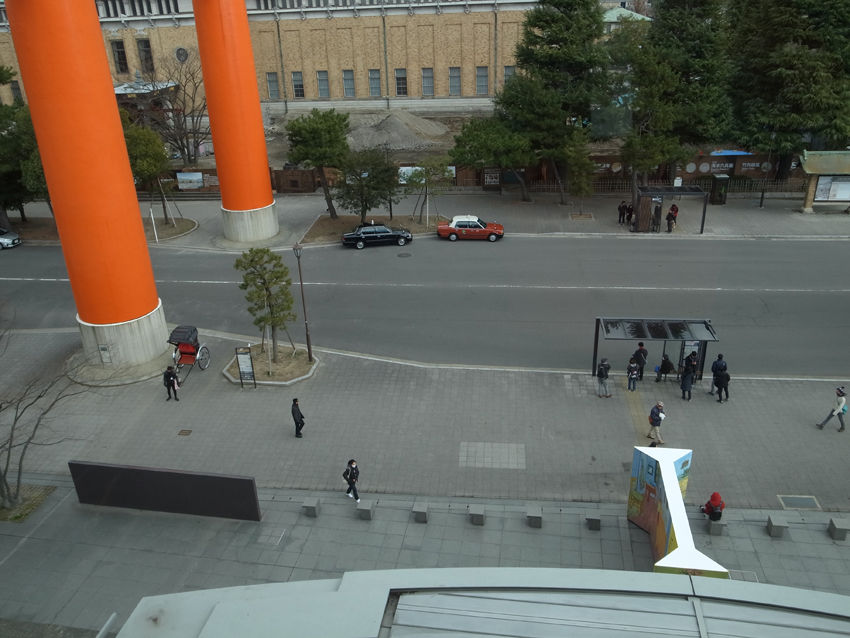 会場を出て4階ロビーから眼下を望むと、平安神宮の大鳥居から北に続く公園を《大ガラス》に見立てた方が、『散種』にふさわしいような気になった。改装工事の進む向かい側の京都市美術館では大型クレーンが単調な回転運動を続けて、「独身者の機械」のようであるし、遠くに見える応天門は3つの「換気弁」がひっつくのに最適であるし、二条通を<境界線>とすると、左側の派出所など『旅行用折りたたみ品』にドンピシャ。京都国立近代美術館を『泉』とするのは当然として、この場合にも彫刻家・富樫実のモニュメントが切断・撤去されて、独身者の欲望は花嫁に届かないままである。1年間続いた祝祭企画が終わる頃、岡崎公園の北西側にある枝垂れ桜が美しく咲き誇り、『パリの空気』ならぬ、京の花吹雪が風に舞う情景を思い描く。《大ガラス》の内部に居るとしたら、晴天のもと、飲めや歌への大騒ぎでありたい。花見で一杯、酒飲みはこれでなければいけません(ハハ)。