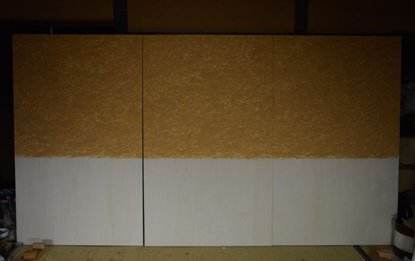次に金箔の空の箔押しを2日間で終了、海の箔押しに必要なのは波をイメージしながらのリズム感と根気ですが、空の箔押しに必要なのは事前にイメージをしっかり頭の中で作る事と最大限の集中力なので、時々なかなか始められなかったりするのですが、無事に済んで良かったです。