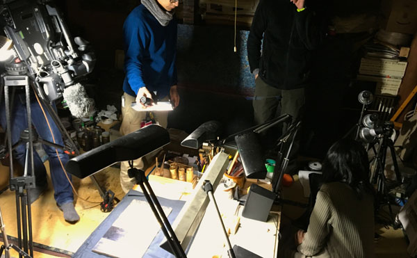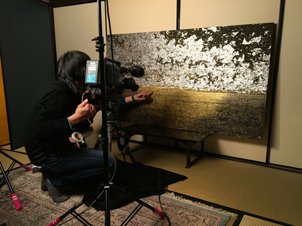 1月上旬の収録では9時間かけてインタビュー、箔押し風景、照明を変化させての作品の撮影をしました。